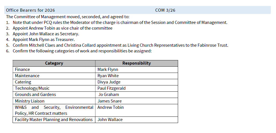 At the Committee of Management (COM) meeting at end of February the responsibilities for 2026 were determined.